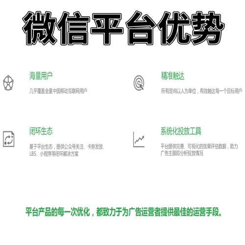 微信公众号广告支持图片形式、图文形式、卡片形式样式投放,适合推荐公众号、活动推广、移动应用推广、卡券推广等活动。为广告主提供了一个成本可控、效益可观的互联网内容营销平台。